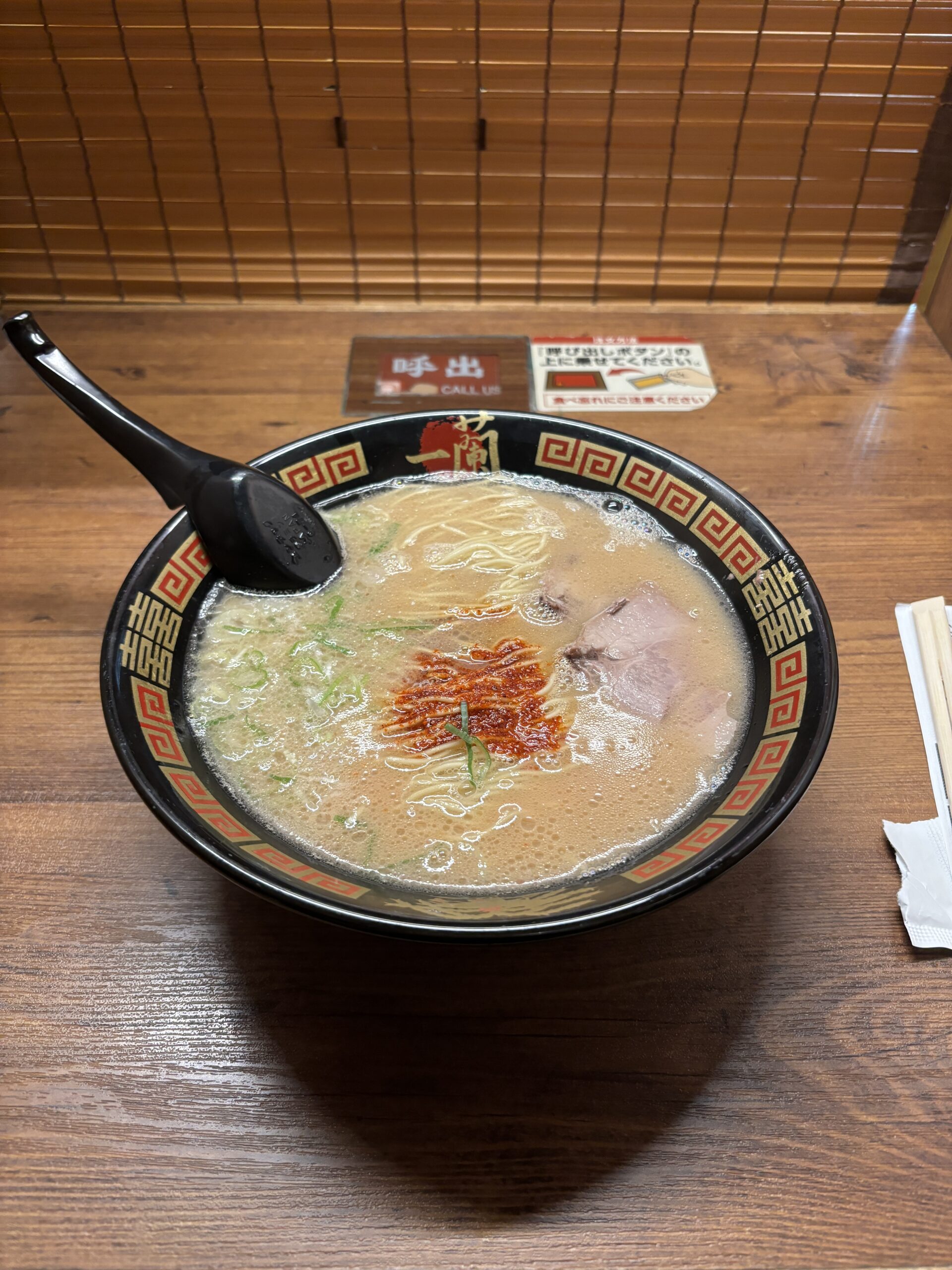 私は辛めが好みなので辛さはマックスで。最初麺の量の少なさに驚いたけれど一蘭は替え玉が基本らしい。無限に食べれそうで怖かった。
