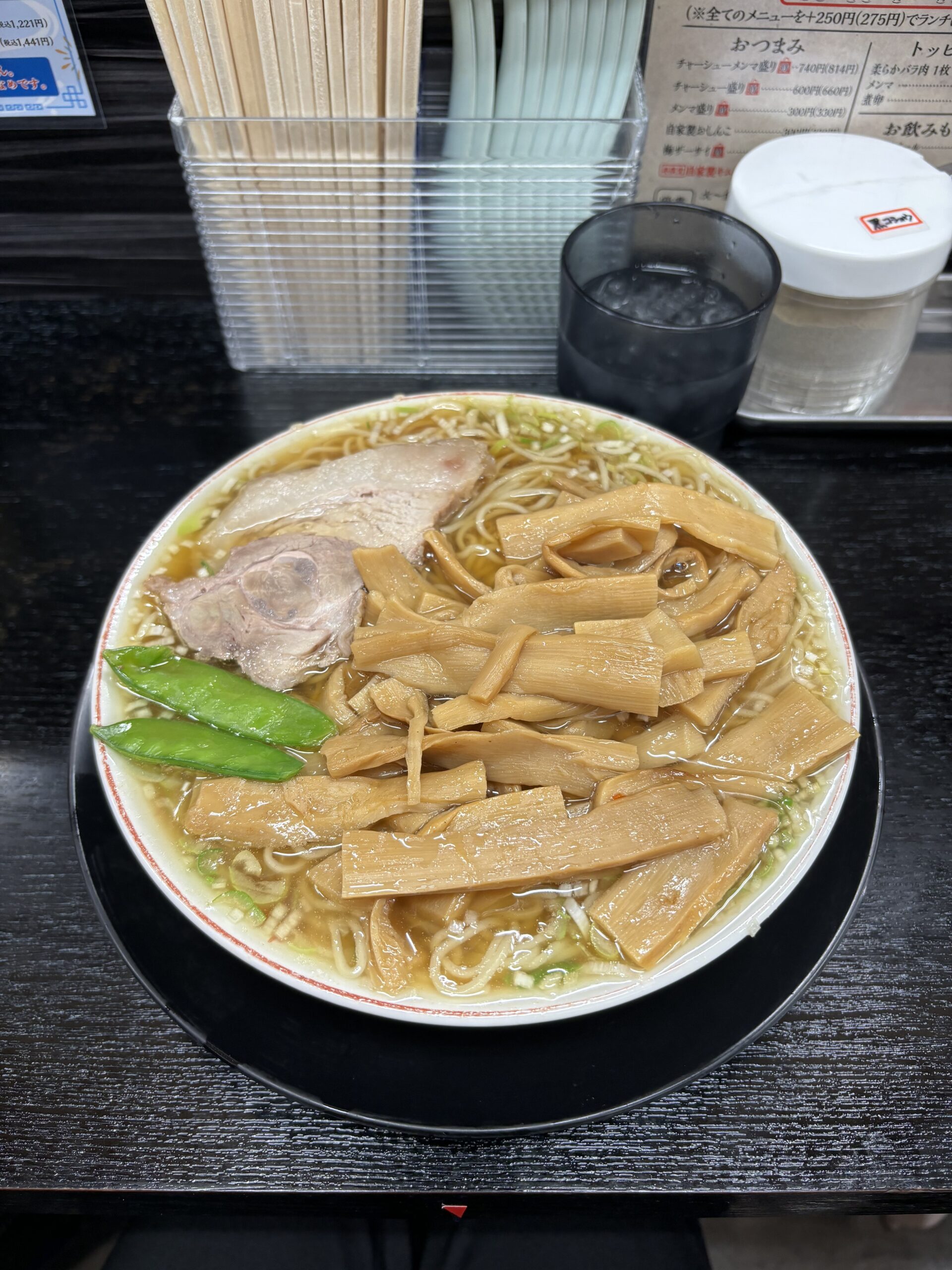 スープは甘め。麺とよく絡み合っていて箸が止まらない。味変で加えるこしょうによってまた新しい味わいが楽しめる。チャーシューも分厚いのでお腹をすかせていかないと完食は至難の業。大食いチャレンジにももってこいなお店だった。